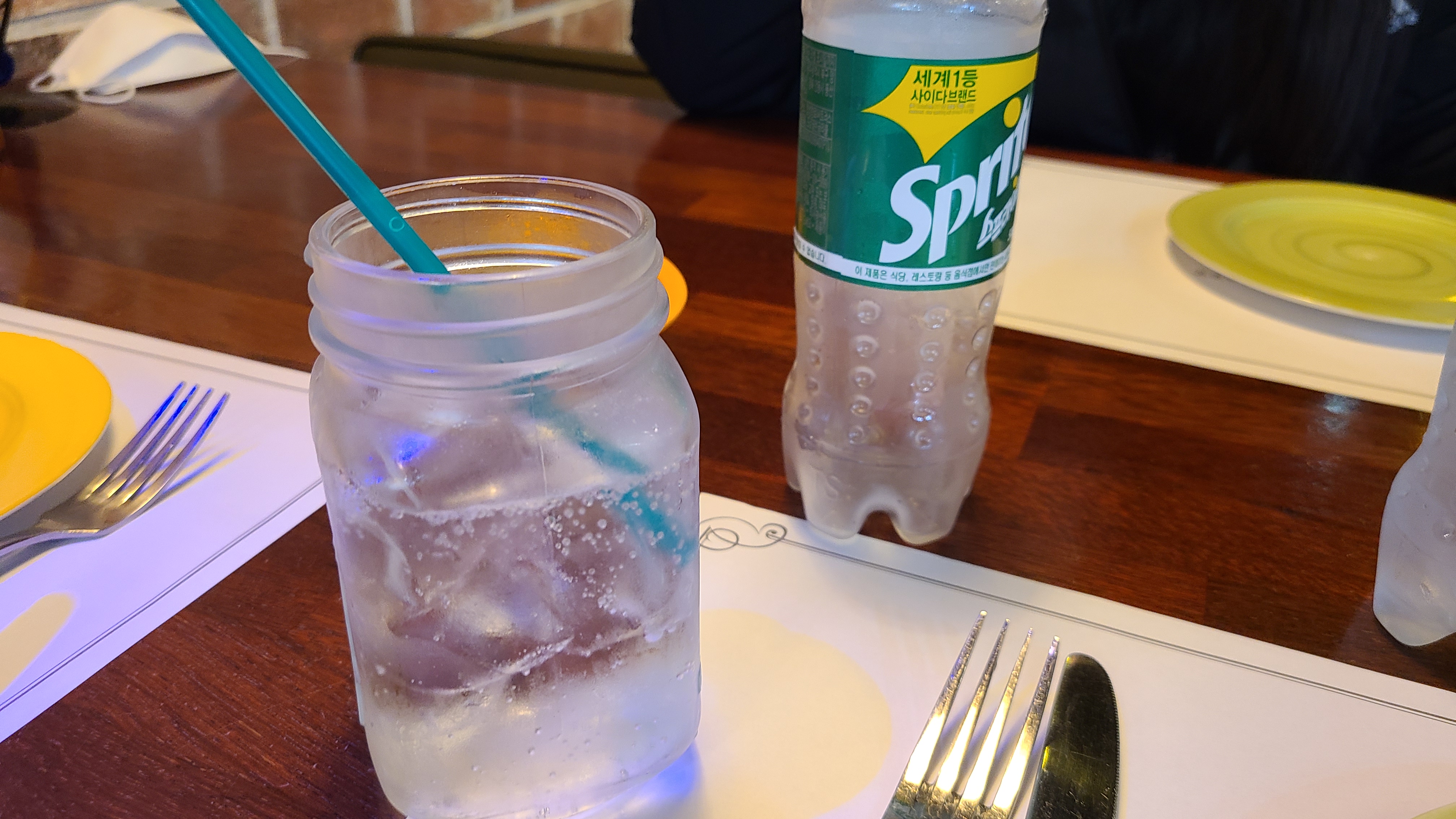 사이다는 칠성 사이다나 킨사이다일 줄 알고 시켰는데 스프라이트를 주어서 익숙하지 않은 사이다 맛이었어요. 다음에는 콜라 1개를 주문해야지.