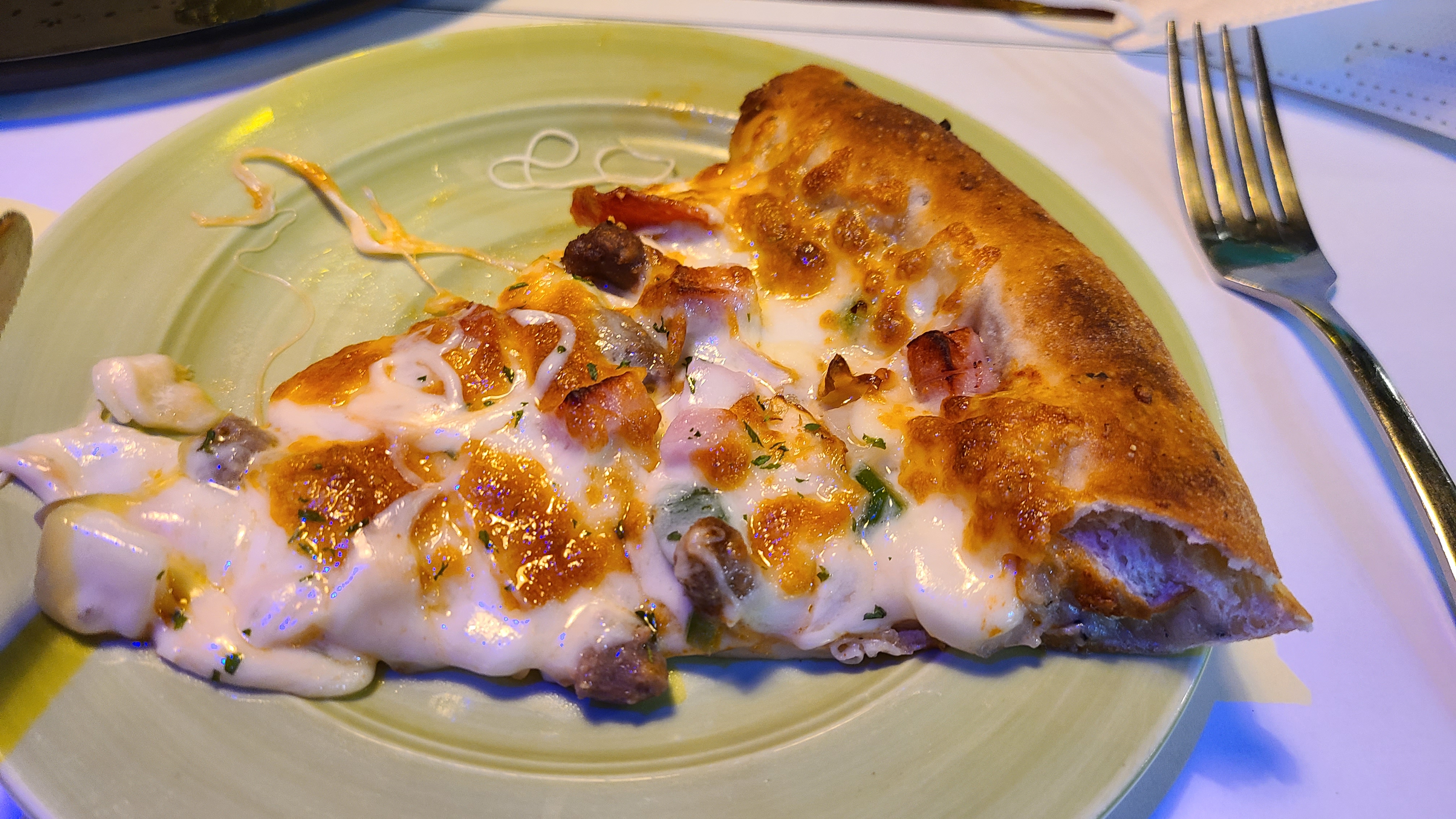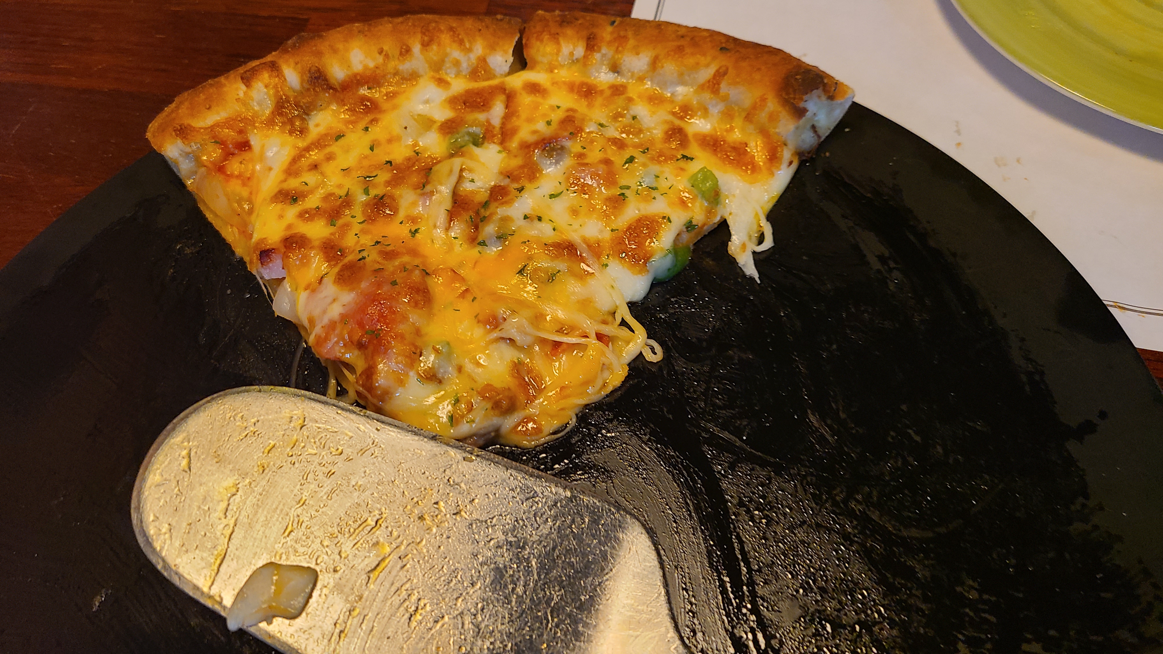 갓 구워져서 나온 피자라 더욱 맛있어보였어요. 도우가 정말 맛있는 집이 무끼이네요. 치즈크러스트 피자라서 가장자리도 맛있었어요. 쭉쭉 늘어지는 치즈가 정말 맛있어요.