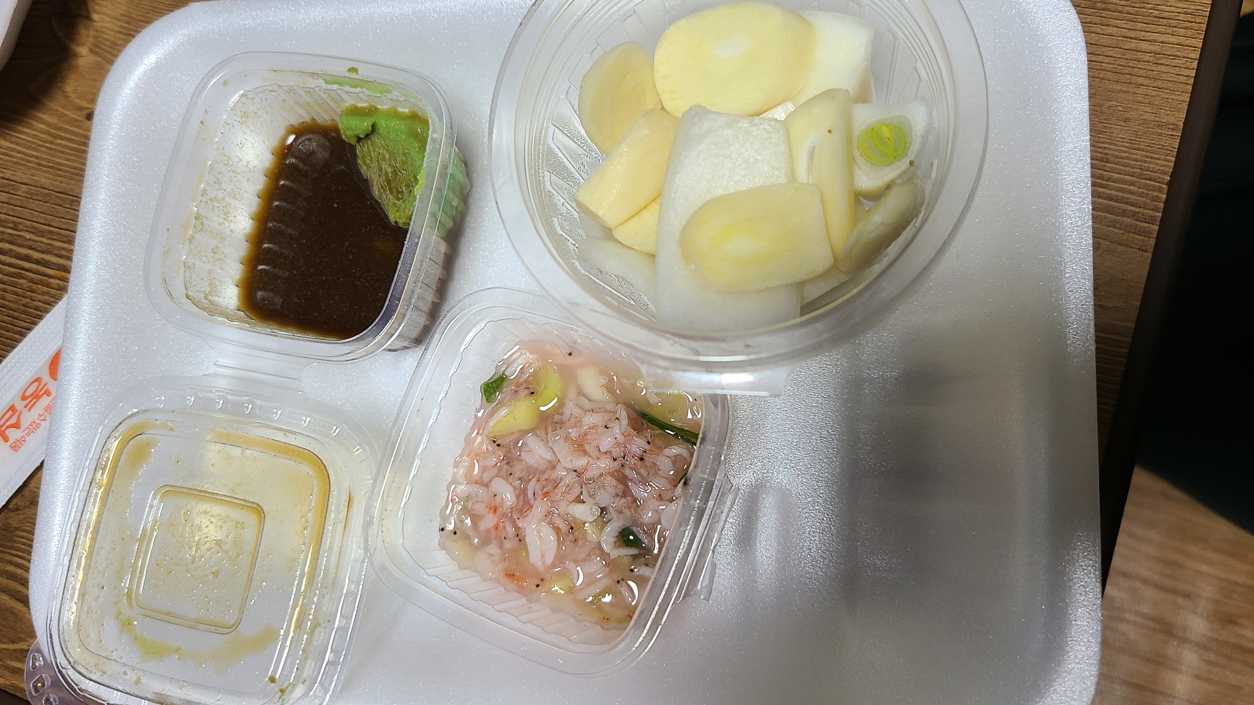 새우젓, 와사비 간장, 마늘, 양파가 있습니다.
