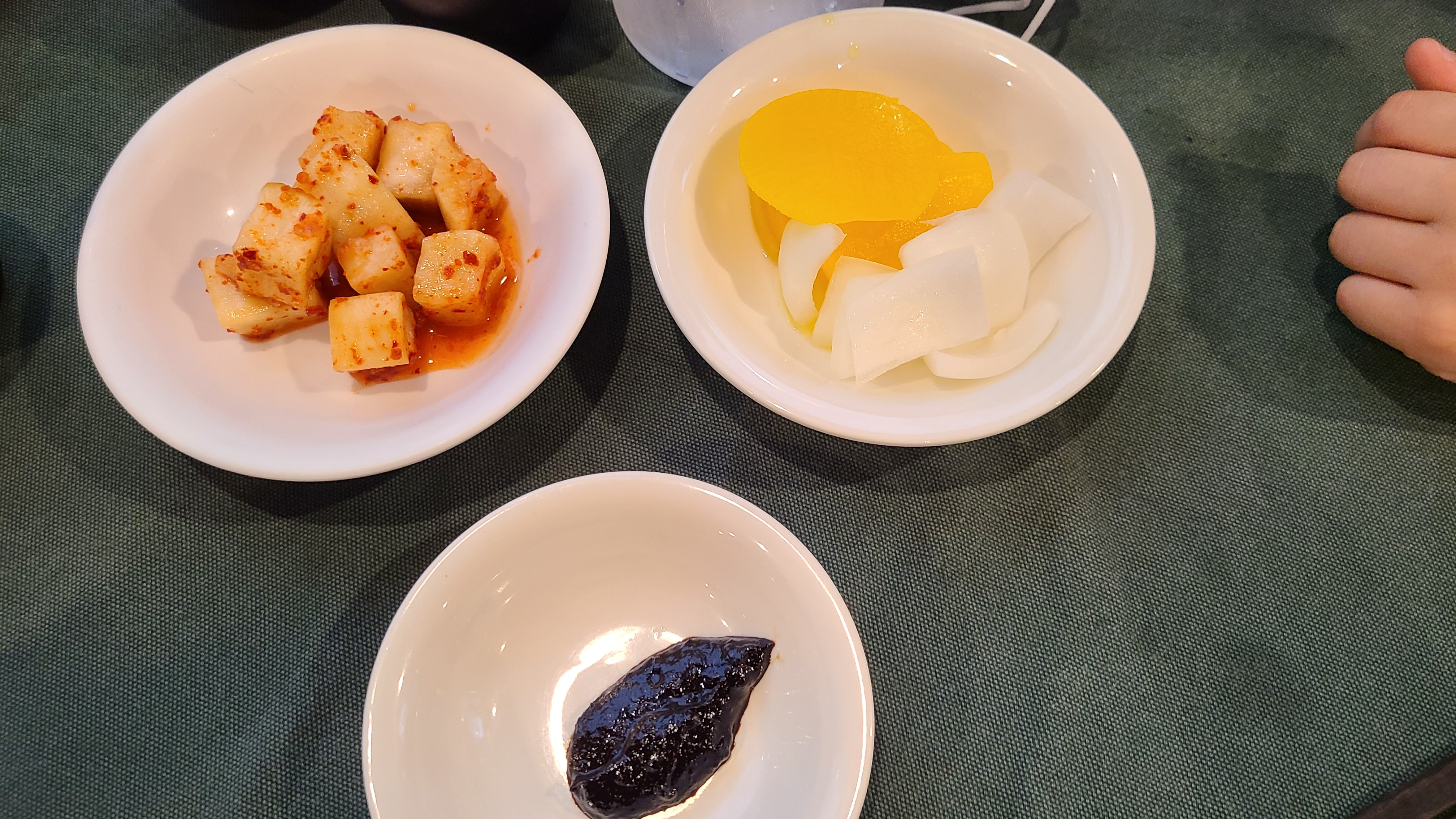 테이블에 깎두기, 단무지, 양파, 춘장이 나왔습니다.