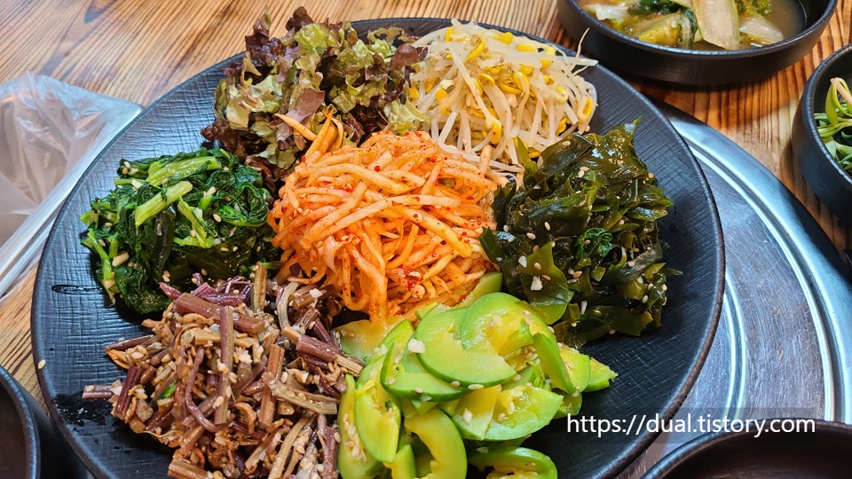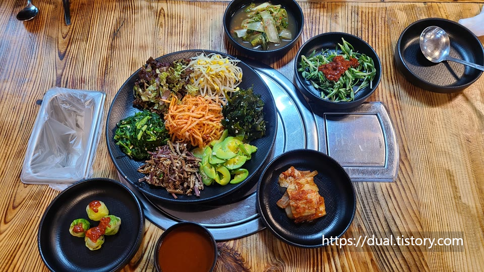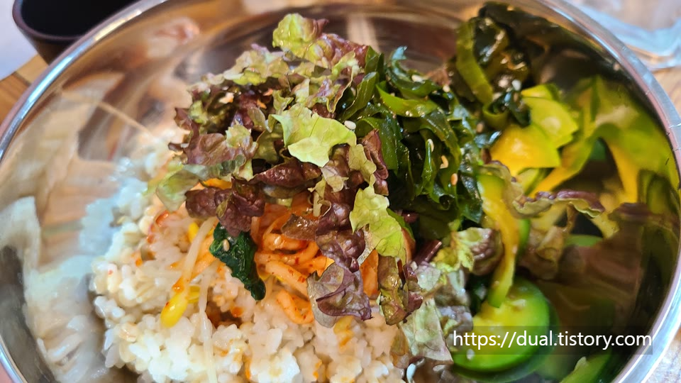 강된장과 나물을 골고루 넣고 고추장을 휙 둘러 쓱싹쓱싹 비벼 먹었습니다. 양이 진짜 많습니다.