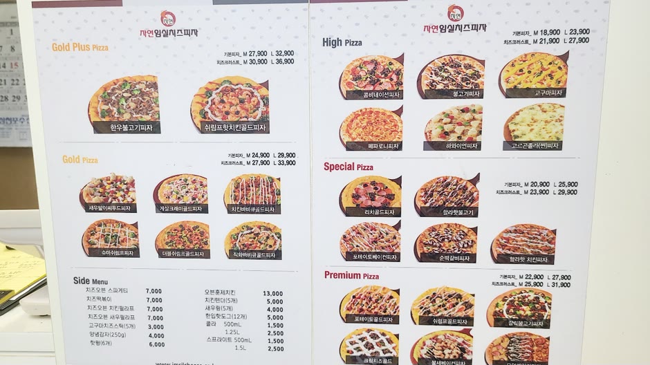 의령 자연임실치즈피자 가격 및 메뉴입니다.
