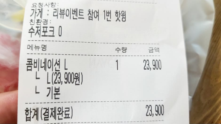콤비네이션 라지로 23,900원인데 방문 쿠폰 할인을 받아서 21,900원에 결제를 했어요