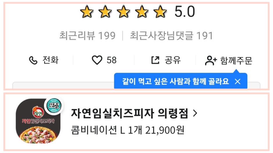 배달의 민족 앱으로 자연임실치즈피자 의령점에 콤비네이션 라지 1개(21,900원)를 주문했어요.