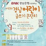 * 딸아이의 일기장에 있는 글을 보내고 싶어서 찾은 BNK경남은행과 함께하는 제17회 경남어린이글쓰기큰잔치입니다. BNK경남은행과 함께하는 제17회 경남어린이글쓰기큰잔치 1. 참가대상 가. 경남지역의 모든 초등학생 2. 응모부분 가. 시, 일기, 생활문 등 종류 구분 없이 낮은 학년, 높은 학년으로 나누어 함. 3. 응모기간 가: 2016. 9. 27(화) ~ 11.23(수) 4. 시상내역 구분 낮은학년 높은학년 계 부상 비고 으뜸상 1명 1명 2명 각200,000원 상장과 부상 (경상남도교육감상) 버금상 3명 3명 6명 각100,000원 상장과 부상 (경남은행장상) 북돋음상 50명 50명 100명 각10,000원 (문화상품권) 상장과 부상 (경남도민일보사장상) 입선 80명 80명 160명 5. 심사기준..